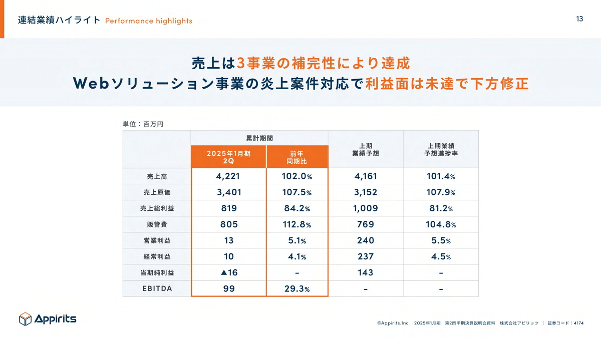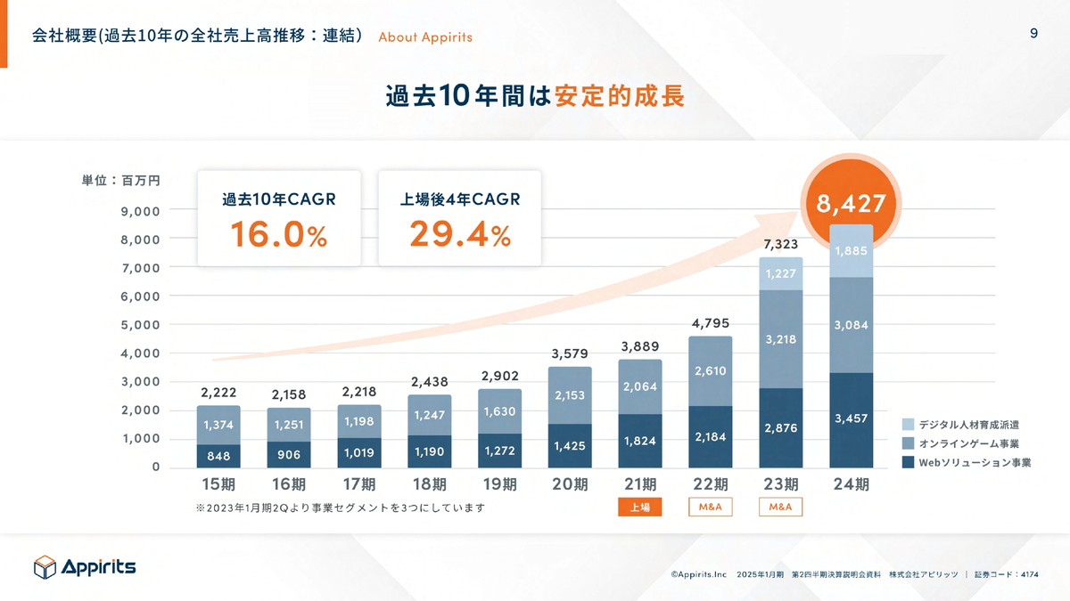 株式会社アピリッツ代表取締役社長の和田でございます。本日は2025年1月期第2四半期の決算説明を行います。まず初めに株主の皆様におかれましては平素は格別のご高配を賜り厚くお礼申し上げます。本日の流れですがコーポレートサマリー、業績のハイライト、業績の修正、今後の成長戦略という段取りで説明をさせていただきます。