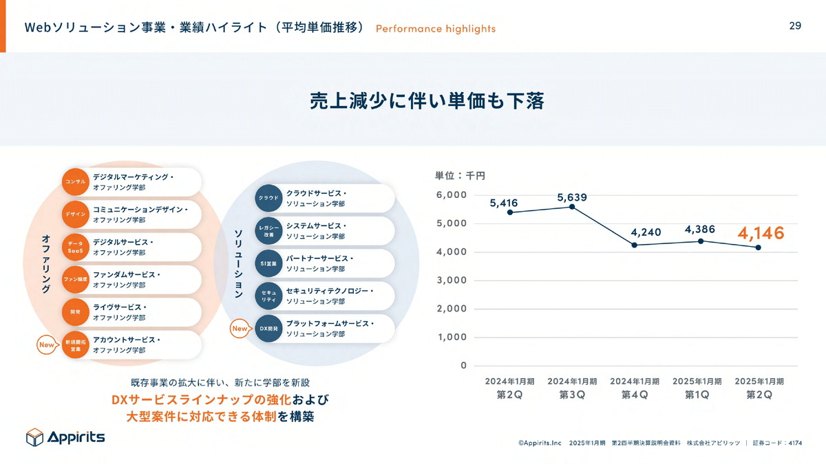 続きましてWebソリューション事業の平均単価の推移です。売上減少に伴い単価も現時点では下落しております。