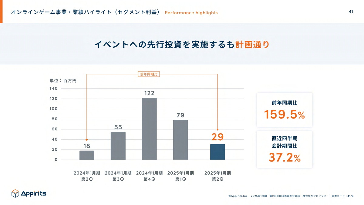オンラインゲーム事業は、基本的には事業譲り受け、運営移管などでミルフィーユのようにそれぞれのタイトルを積み増しして、売り上げを伸ばしていくという事業モデルを描いております。現在、ちょうど第1四半期に「テニスの王子様」のゲームを運営移管ということで新しいタイトルを増やしまして、今現在、新規の運営移管プロジェクトが2件営業中です。これらが増えてくるとしっかりと売り上げが来年に向かって上がってくるイメージになってくると考えております。