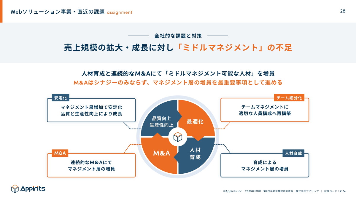 今後、M&Aも引き続き行っていきます。ちょうど第2四半期にWebソリューション事業で1社ジョインいたしました。今いくつか検討中の会社がございまして、これらをしっかりとジョインさせつつ、ミドルマネジメントを増やして、大きな会社にしていく、耐えられる会社にしていくことが考えているビジョンでございます。