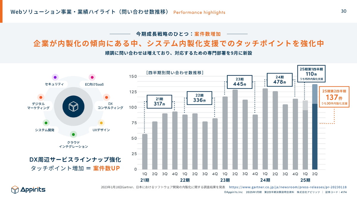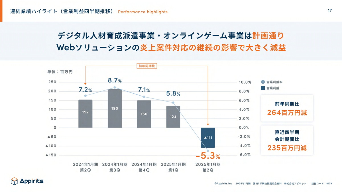 アピリッツ<4174>は、2025年1月期第2四半期の決算説明の動画を公開した。和田順児社長は、Webソリューション事業における大規模な炎上案件の対応に伴い、売上高は計画通りだったが、営業利益が大幅に減少し赤字となったと説明した。その他の事業は概ね計画通りに推移したという。その後、炎上案件の原因と対策、今後の成長戦略、株主還元方針などを丁寧に説明していった。
