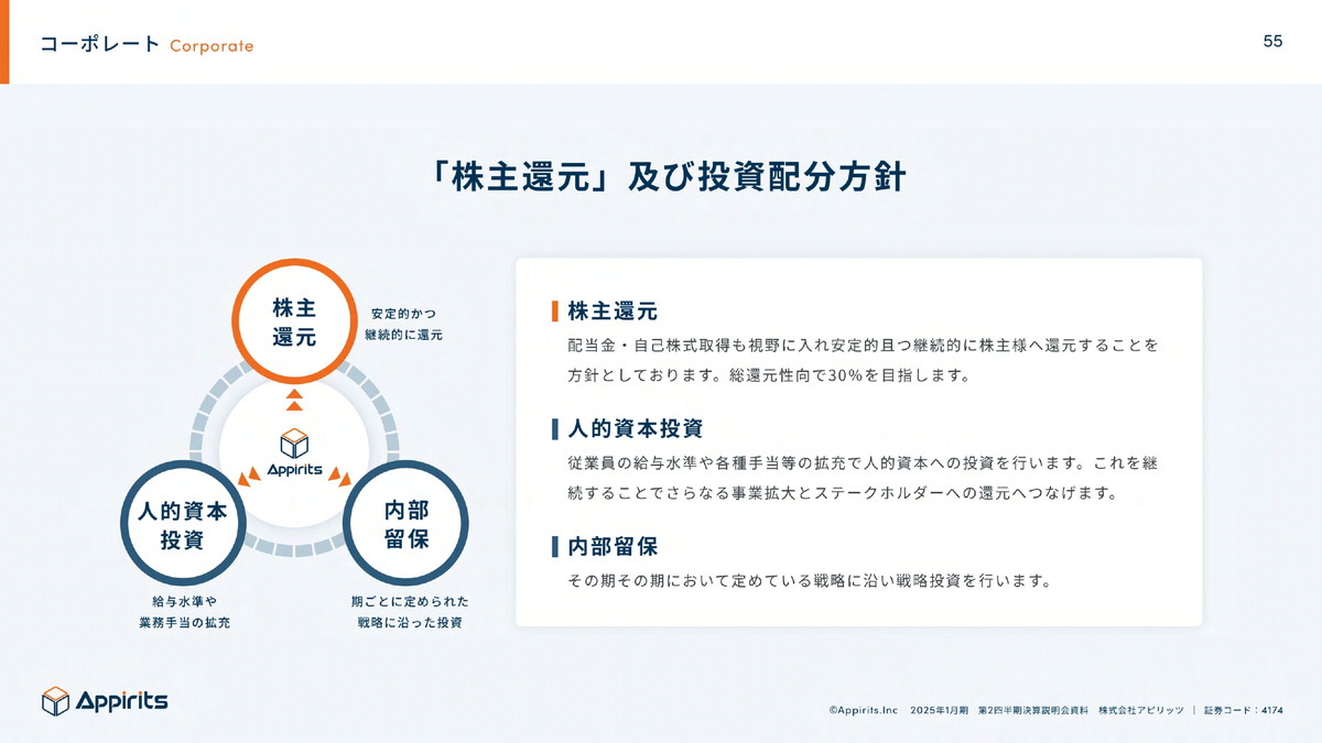 株主還元、人的資本への投資、内部留保のバランスを重視している。人的資本投資の一環として、本社移転や海外投資家向け英文開示の開始、IR強化などを行っている。今後も適切な株主還元を継続する方針。