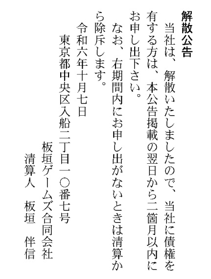 なお、これに先立ち、2010年9月に設立され、板垣氏が代表を務める「株式会社板垣プロダクション」が2024年9月に「株式会社板垣ゲームズ」に商号変更しており、こちらは存続しているようだ。登記簿謄本を確認して判明した。