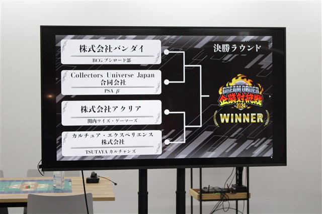 予選はスイスドロー3回戦まで実施。予選の結果、見事本戦に進出したのは株式会社バンダイ、Collectors Universe Japan合同会社、株式会社アクリア、カルチュア・エクスペリエンス株式会社の4企業となった。
