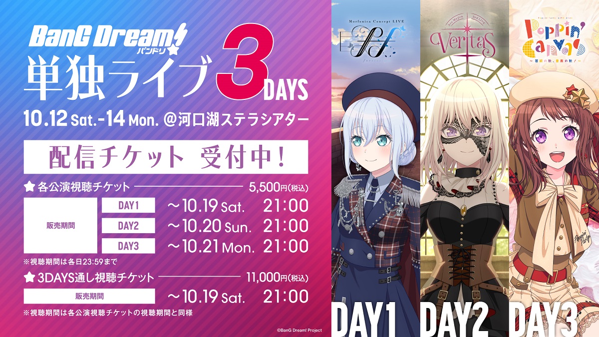 2024年10月12日(土)~14日(月・祝)、河口湖ステラシアターにてバンドリ!の単独ライブを3DAYSで開催する。Morfonica、Ave Mujica、Poppin'Party、それぞれのバンドの単独ライブとなる。