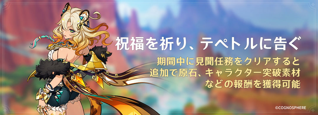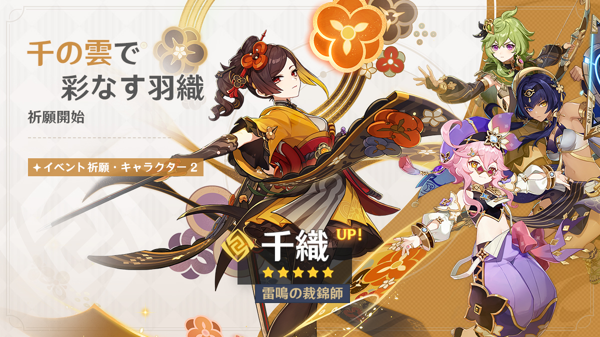 10月9日アップデート後より、イベント祈願・キャラクター「鍛火の祝福」、イベント祈願・キャラクター2「千の雲で彩なす羽織」を開始した。期間中、ピックアップキャラクターの出現確率が大幅にUPする。