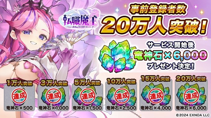 本作の事前登録者数が20万人を突破した。さらにガチャ総回転数200万回とXのフォロワー数が1万人を達成しましたので、リリース時に「竜神石」1万2500個の全員プレゼントが決定した。