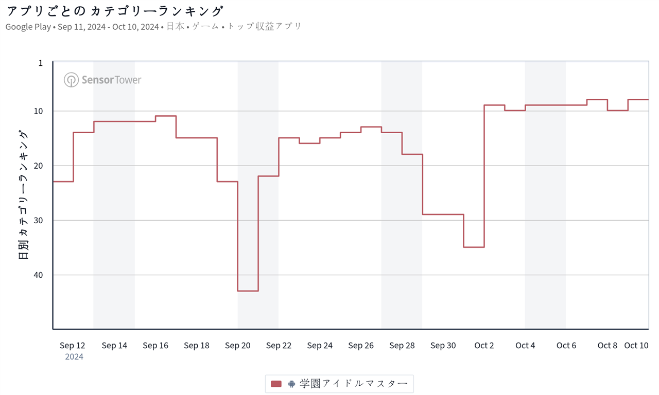 また、バンダイナムコエンターテインメントの『学園アイドルマスター』が8位に順位を上げてきた。『学マス』は、シーズン限定プロデュースアイドル「【仮装狂騒曲】篠澤 広」が登場した「仮装狂騒曲 広ガシャ」を10月8日より開催しており、ここからさらに上位をうかがうことになるのか注目されるところ。