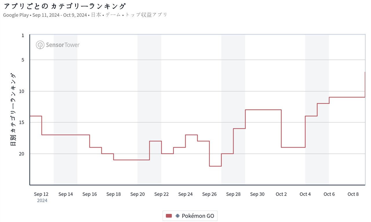 トップ10圏内では、Nianticとポケモンの『ポケモンGO』が前日の11位から7位に上昇した。『ポケモンGO』は、GOロケット団が登場する「ガラル探検:占拠」イベントを10月8日0時より実施していることなどが足元の順位上昇につながっているもようだ。