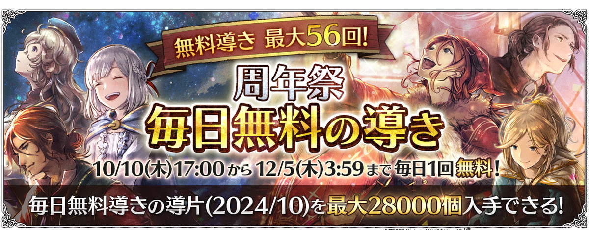期間中、ゲームにログインすると1日1回、最大56日間で56回の無料「導き」を行える。本導きを行うことで「毎日無料導きの導片(2024/10)」をおまけとして獲得できる。「毎日無料導きの導片(2024/10)」を集めると、交換所で「歴戦の聖導印」、「各ジョブのクラスアップの聖印」、「レベル 1 アップベリー」などのアイテムと交換することが可能となる。