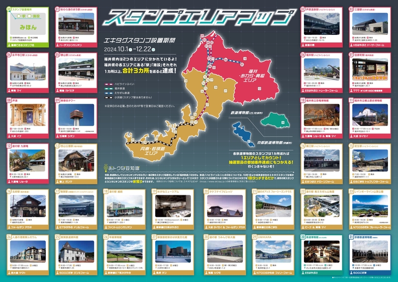 「駅」:あわら湯のまち駅、芦原温泉駅(ハピラインふくい)、三国駅、 永平寺口駅 、勝山駅、福井駅(ハピラインふくい)、田原町駅(10月18日から取得可能)