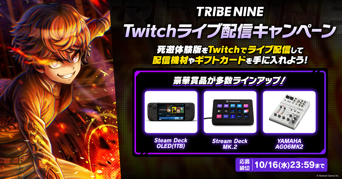 日本時間10月11日(金)より「Twitch配信者キャンペーン」の応募を開始。10月15日(火)の体験版リリースに合わせて、Twitchにてカテゴリー「TRIBE NINE」を選んで配信を行い、合計配信時間数または平均同時視聴者数の上位20名にはSteam Deckや配信機材など豪華報酬を進呈。