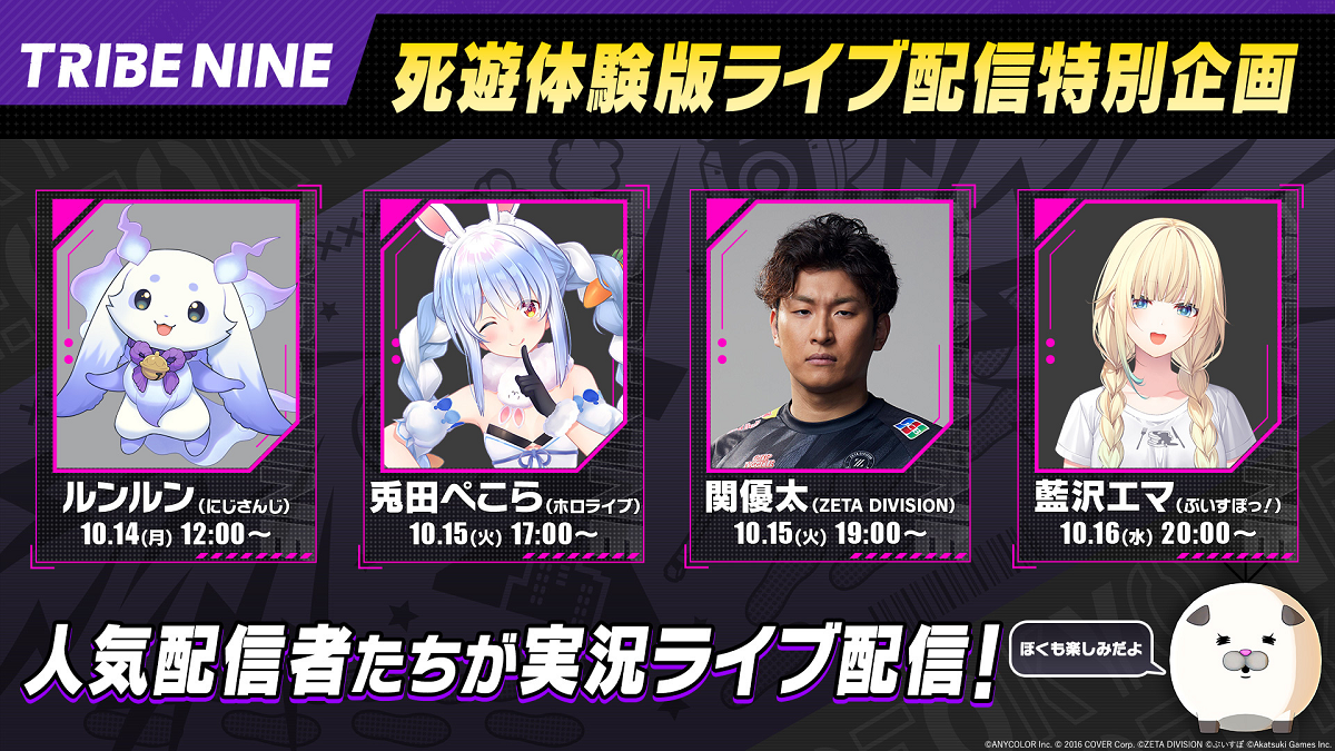 人気ストリーマーと人気VTuberたちが「死遊体験版」を実況配信する。「#トライブナイン」をつけて、「死遊体験版」を一緒に楽しもう。