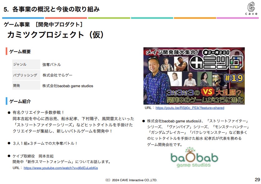 ケイブ<3760>は、10月11日、2025年5月期の第1四半期(6~8月)の連結決算を発表した。今回はその決算説明資料の中から、同社のゲーム事業の開発中プロダクトの状況を見てみたい。