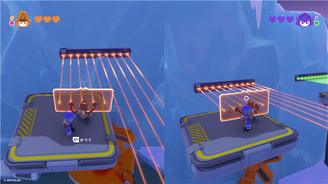 ▲こちらがステージギミックの一例。バリアを作ることで同じ色のレーザー攻撃を防ぐことができる。バリアを張る方向も自在に調整可能となっているので、対応した色のバリアを張れる人が仲間をかばいながら進めるようになっている。