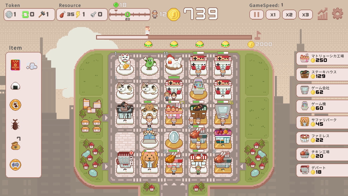 「超増税都市」は、施設を建設して大金を稼げる街を作るローグライトゲーム。ランダムに抽選される施設から施設を選択しマップに建設、自動で動く住民が施設に入ると作業を行い報酬を獲得できる。ステージ終了までに指定した金額を稼ぐことが目標。