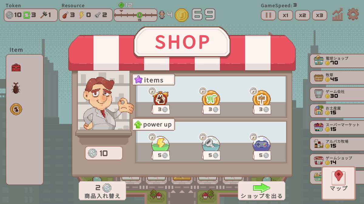 施設には効果が付いており、相性の良い施設を上手く選択出来れば爽快に大金が稼げる。かんたん操作でテンポが良く、クリアするまで何度も遊んでしまうゲームになっているという。