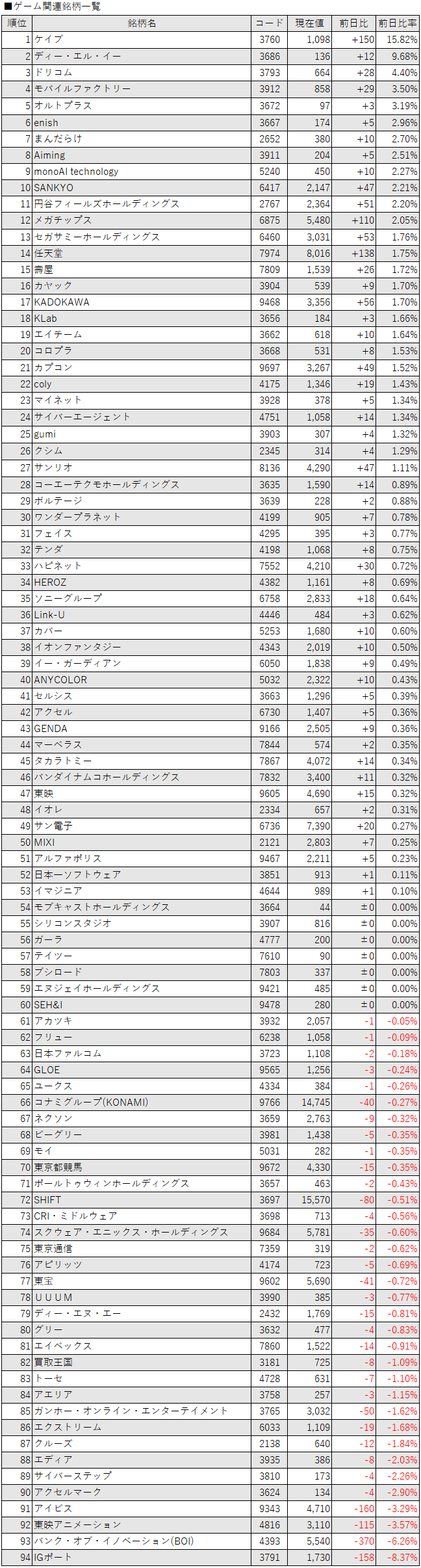 こうしたなか、ゲーム・エンタメ関連企業をみると、登録されている94銘柄のうち、上昇は53銘柄(56%)、下落は34銘柄(36%)、変わらずは7銘柄(7%)で、上昇した銘柄のほうが多かった。