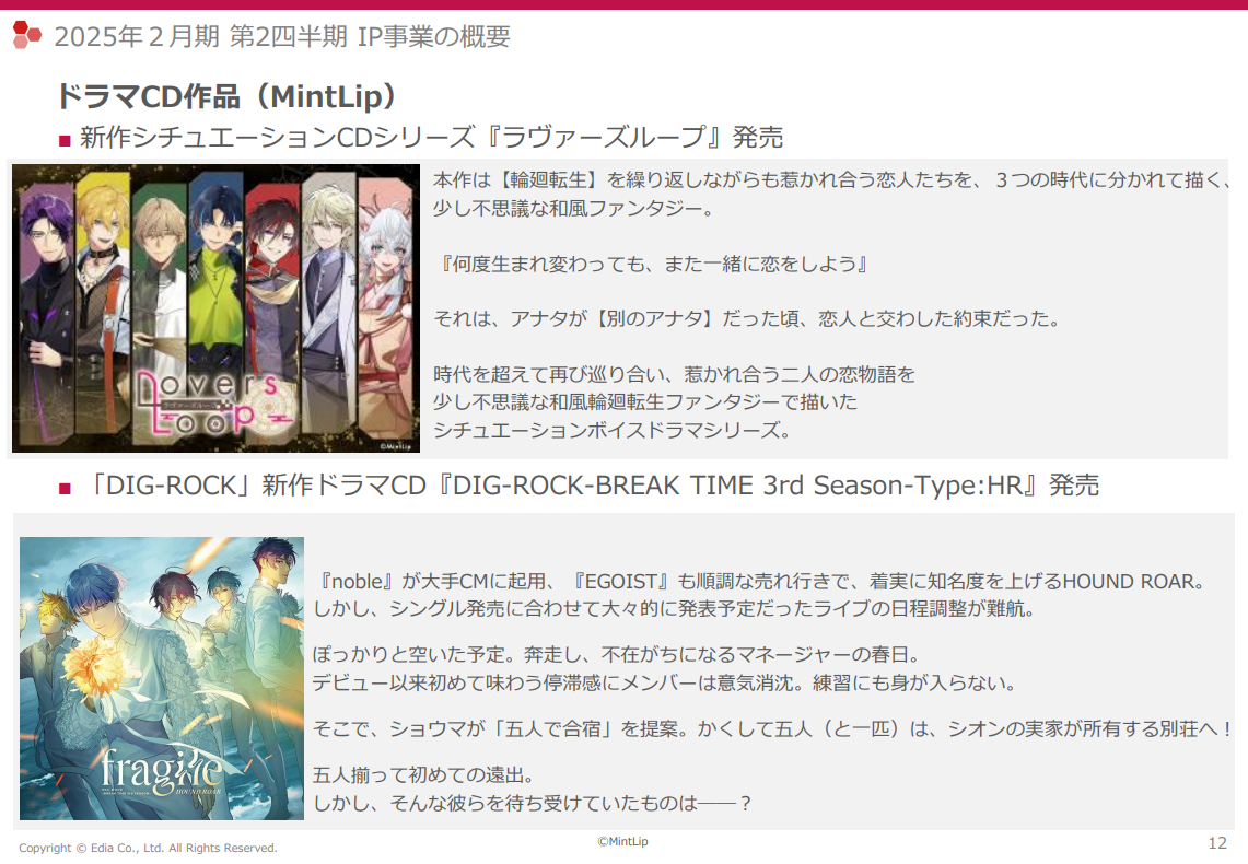 同社のIP事業は、ゲーム運営のほか、音楽や音楽・ドラマCDなどの制作、ライセンス事業、受託開発などを行っている。
