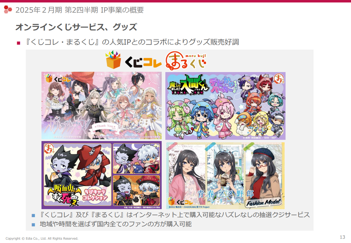 オンラインくじについては、「ポールプリンセス」や「魔入りました!入間くん」「吸血鬼すぐ死ぬ」「青春ブタ野郎シリーズ」とのコラボ商品を行ったとのこと。オンラインくじは、採算性も高く同社の大幅増益にも大いに貢献したという。