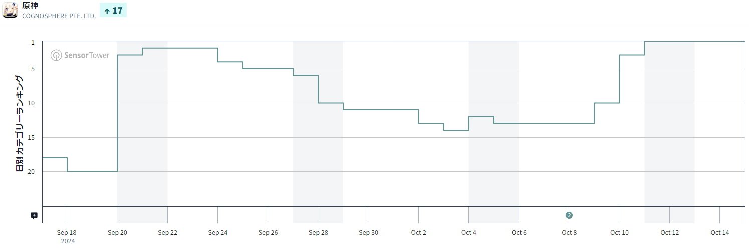 10月16日9時40分現在のGoogle Playのセールスランキング(ゲームカテゴリー)は、COGNOSPHEREの『原神(げんしん)』が首位をキープした。先週末に首位を獲得して以来、ポジションをキープしており、これで5日連続となる。同タイトルは、10月9日に新★5 キャラクター「シロネン(岩)」らが登場するイベント祈願やイベント「追え!ミツムシのお宝」などを開催するVer.5.1「燃ゆる運命の虹光」を10月9日に実装した。その2日後となる10月11日に首位を奪還し、現在に至っている。