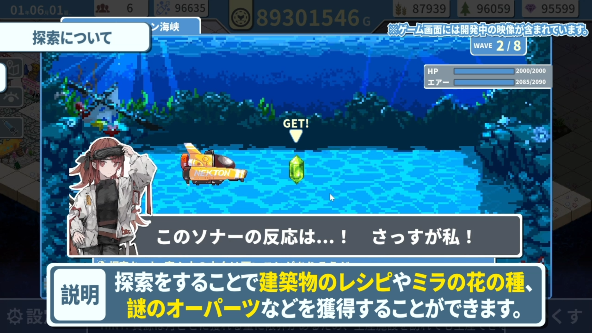 新しい建築物のレシピやミラの花の種、ストーリー解放に必要な謎のオーパーツ、エリア解放アイテムを手に入れるために探索を行う必要がある。探査艇に乗り込み、深海に潜む敵やトラップを搔い潜りながらアイテムの入手、踏破することが目的になる。探査艇には、HP、エアー、積載量の3つのパラメーターがあり、それぞれお金を使って強化ができる。また、探索を助けてくれるアイテムもお金で購入することができ、これらの要素を駆使して深海の攻略や都市開発を進めていくことになっていく。
