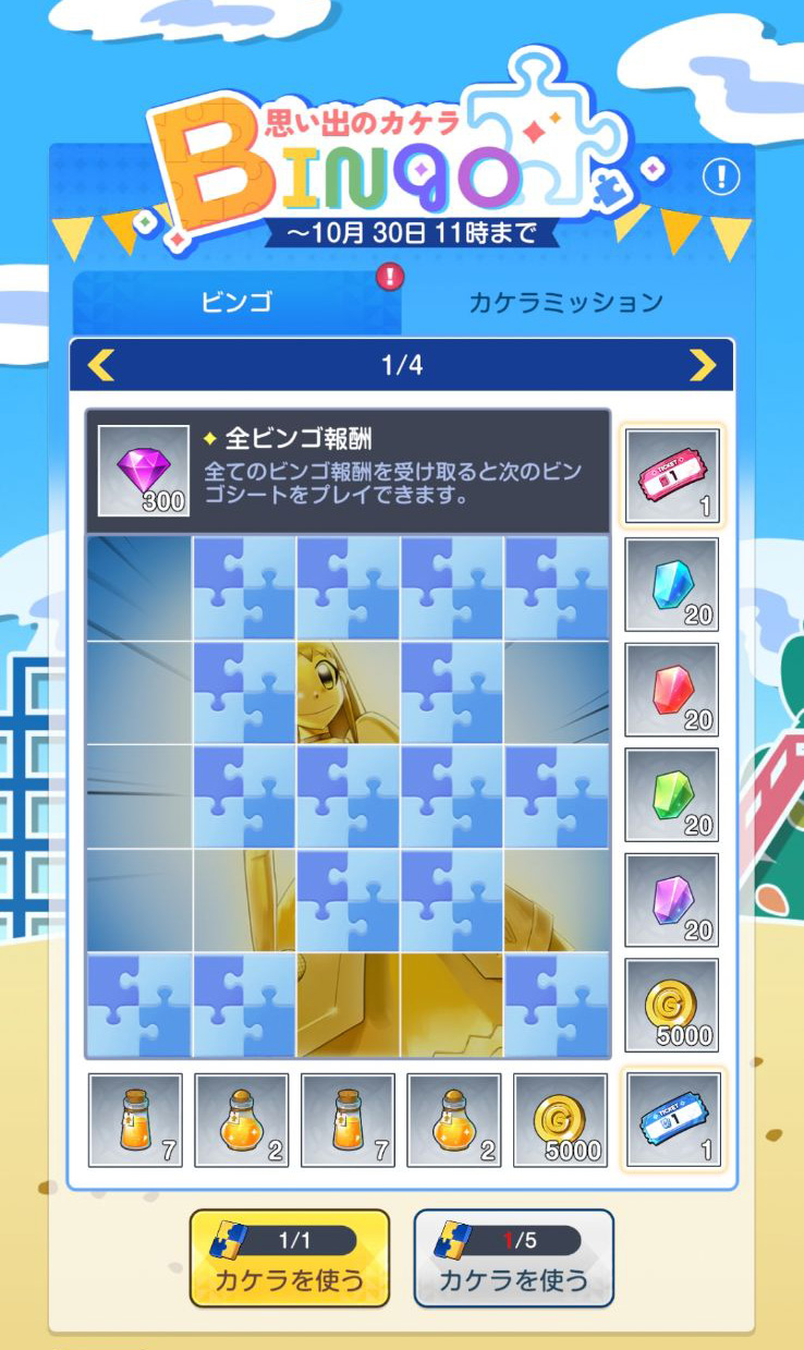 指定数の経験値ポーションの入手などのカケラミッションをクリアすると、「カケラ」がもらえる。「カケラ」を消費して、マスを開けていくと報酬がもらえる。
