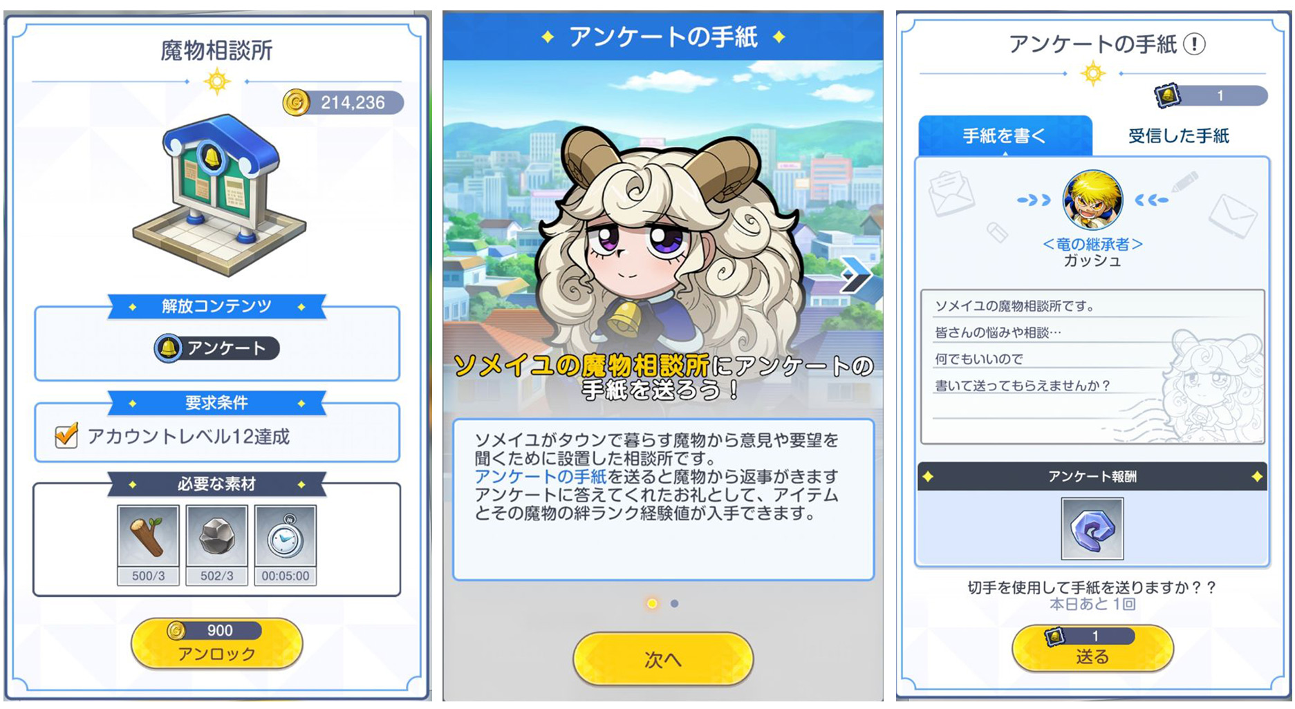 タウン内に新コンテンツ「ソメイユの魔物相談所」が登場する。「ソメイユの魔物相談所」では、魔物を指定し、アイテム「切手」を消費することにより、アンケートの手紙を送ることができる。8時間後に返事を受け取ると、指定した魔物の絆ランク経験値やアイテムを入手できる。
