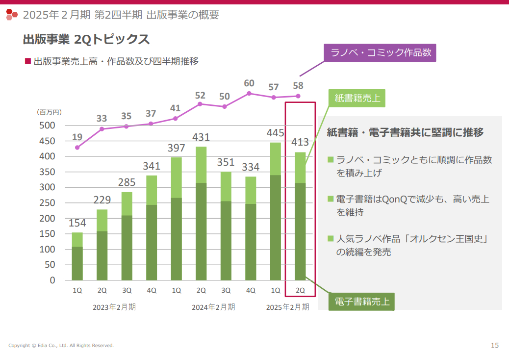 エディア<3935>の2025年2月期 8月中間期における出版事業の売上高は前年同期比3.6%増の8億5800万円だった。初の2四半期連続の売上高4億円超えとなった。同社の出版事業については、一二三書房が中心となっているが、電子書籍の売上が好調だった、としている。