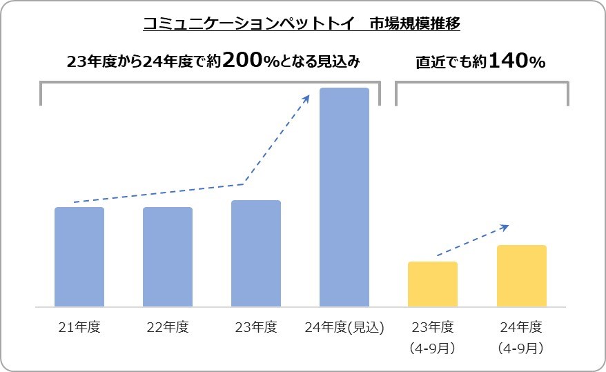 音声、光、動きなどの機能を持ち、話しかけたり、さわったりすると応答するペットトイのニーズが、コロナ下の巣ごもり需要で広がった。今年は複数のメーカーから大型の商品が発売され、市場金額が大きく伸長すると予想している。直近の2023年4-9月および2024年4-9月の比較では前年度比140%に拡大しており、2023年度から2024年度にかけては前年度比200%に拡大すると見込んでいる。