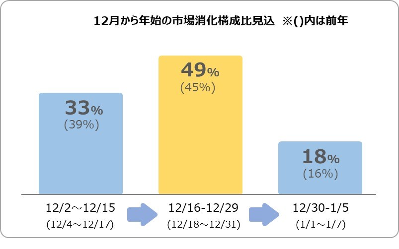 クリスマス当日が月曜日だった昨年のクリスマス需要は第3週(12/18週)に集中したが、今年のクリスマス需要はクリスマス直前の土日を含む第3週(12/16週)に加え、駆け込み需要が見込まれる23日(月)と24日(火)を含む第4週(12/23週)に分散すると予想される。同社では、12月の第1週(12/2週)から第5週(12/30週)における第3週から第4週の売上構成比が2023年実績の45%から49%に増加すると推測している。