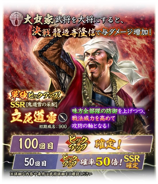 ■SSR【鬼道雪の采配】立花道雪がピックアップ!「特別登用・共闘 第12期『決戦 龍造寺隆信』」開催!