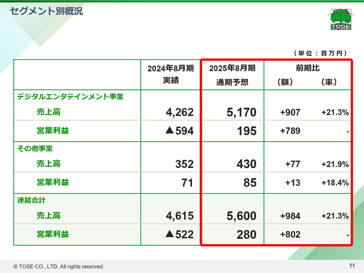 セグメント別では、主力のデジタルエンタテインメント事業は、売上高が同21.3%増の51億7000万円、営業利益が1億9500万円(前の期5億9400万円の赤字)と黒字転換する見通し。
