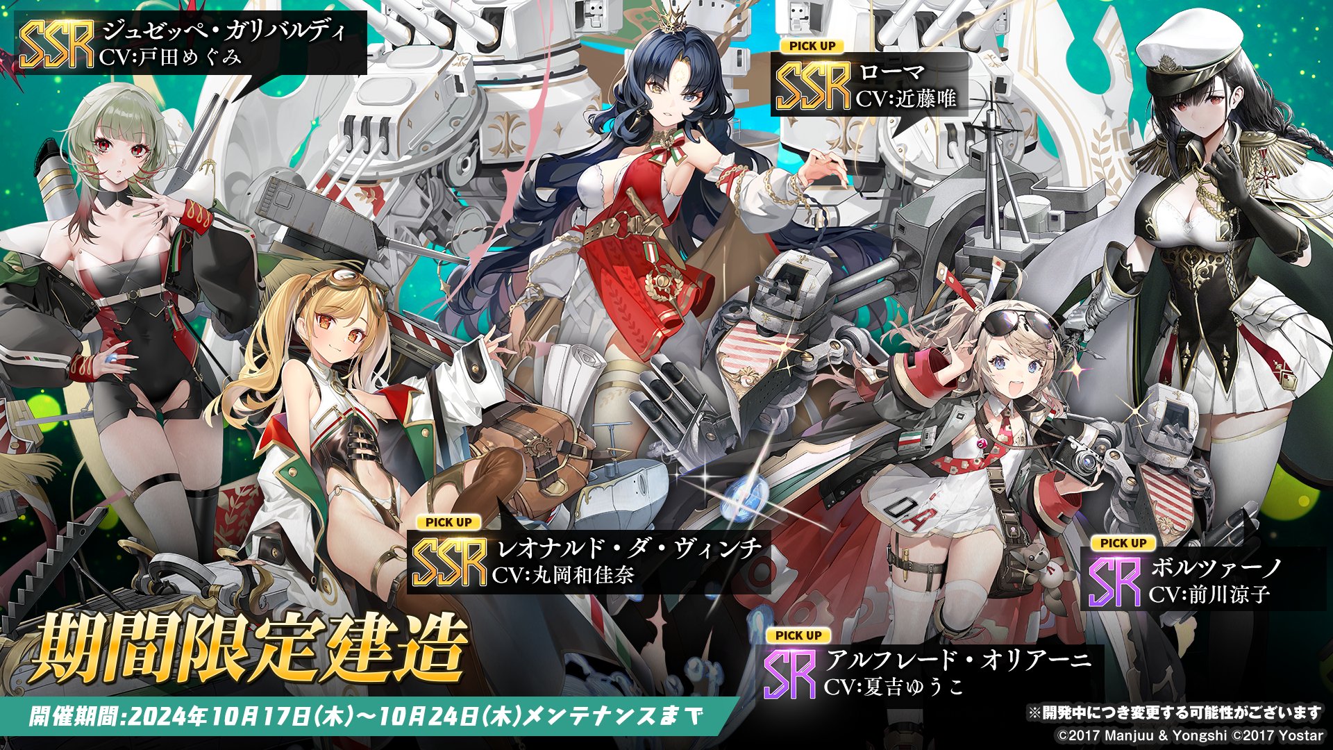 SSR戦艦「ローマ」、SSR潜水艦「レオナルド・ダ・ヴィンチ」たちが復刻実装で登場する期間限定建造を開催する。