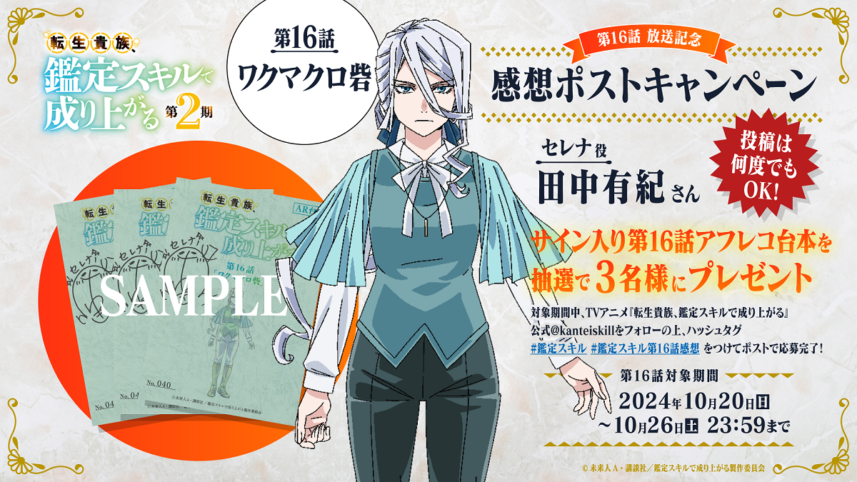 TVアニメ『転生貴族、鑑定スキルで成り上がる 第2期』第16話(第2期4話目)放送を記念して、セレナ・バンドル役 田中有紀さんのサイン入り第16話台本を、3名にプレゼント。