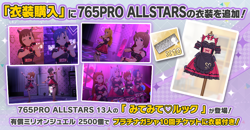 「みてみて♡ルック(765PRO ALLSTARS)」を追加した。プラチナガシャ10回チケット1枚に13人分の衣装付きとなっており、衣装購入で購入利用できる。
