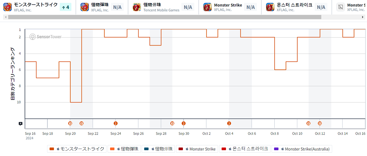 2024年10月12日~10月18日のApp Store売上ランキング上位の状況を振り返っていこう。まず、首位争いから見ていくと、序盤から中盤まで『モンスターストライク』を中心に展開していたが、終盤になると『パズル&ドラゴンズ』と『Fate/Grand Order(FGO)』が1日ずつ首位を獲得した。首位獲得タイトルは以下の通り。