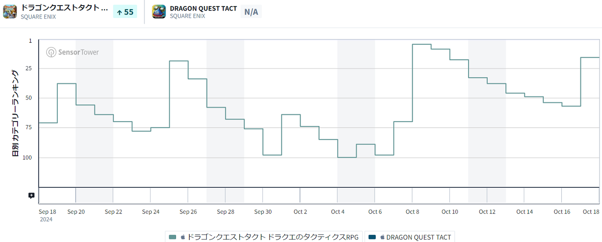 そうした中、スクウェア・エニックスの『ドラゴンクエストタクト』が前日57位から16位に浮上している。
