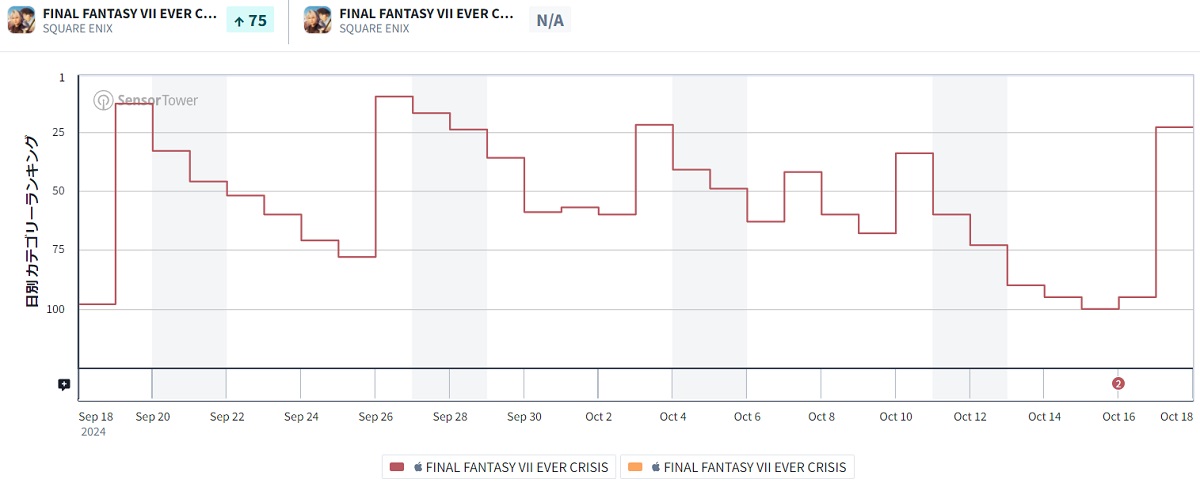 | 23 | 95 | ↑72 | FINAL FANTASY VII EVER CRISIS | スクウェア・エニックス<9684> |