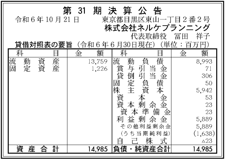 2.5次元ミュージカルで知られるネルケプランニングの2024年6月期(第31期)の決算は、最終利益が16億3800万円だった。10月21日付の「官報」に掲載された「決算公告」で判明した。