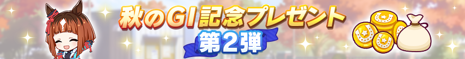 「秋のGⅠ」の開催を記念して、ゲーム「ウマ娘 プリティーダービー」では、「秋のGⅠ記念プレゼント第2弾」をトレーナーにプレゼントする。プレゼントの詳細は下記のとおり。