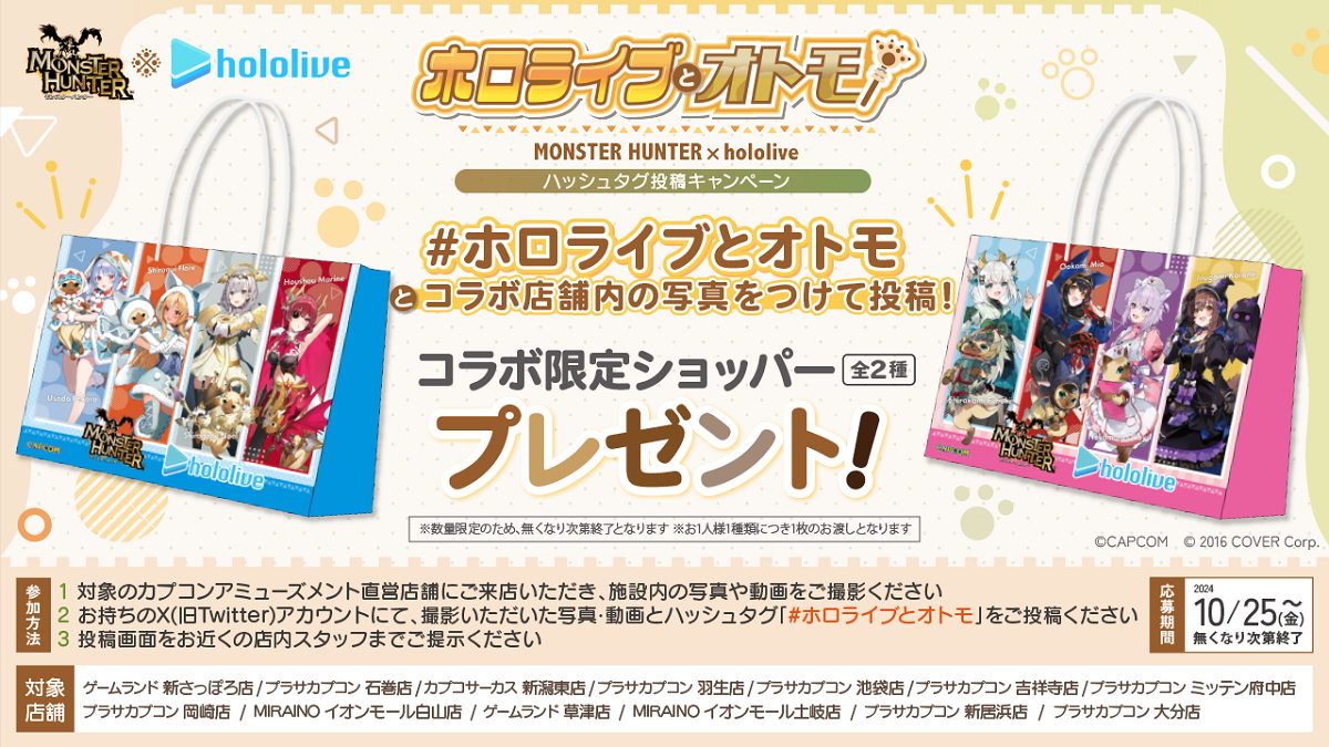 「モンスターハンター×ホロライブゲーマーズ」の開催に合わせて、Xアカウント上で専用ハッシュタグ「#ホロライブとオトモ」と「コラボ店舗の写真」を付けて投稿した人にもれなく「コラボ限定ショッパー」を全2種の内、どちらか1つをプレゼント。