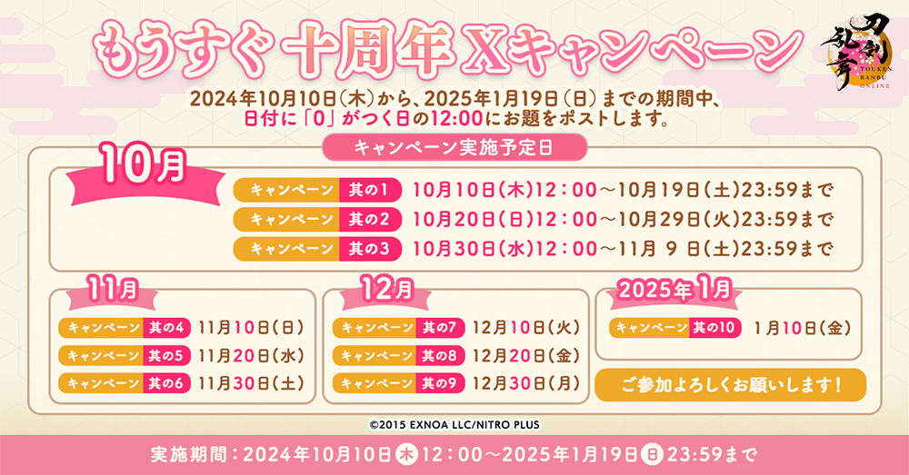 十周年へ向けたカウントダウンキャンペーンとして、公式Xで豪華賞品が抽選で当たる「『刀剣乱舞ONLINE』もうすぐ十周年Xキャンペーン」を実施している。2025年1月19日までの期間中、「0(ゼロ)」がつく日に公式Xからお題をポストする。『刀剣乱舞ONLINE』の思い出をポストしたり、クイズに参加した人の中から抽選で豪華景品をプレゼントする。