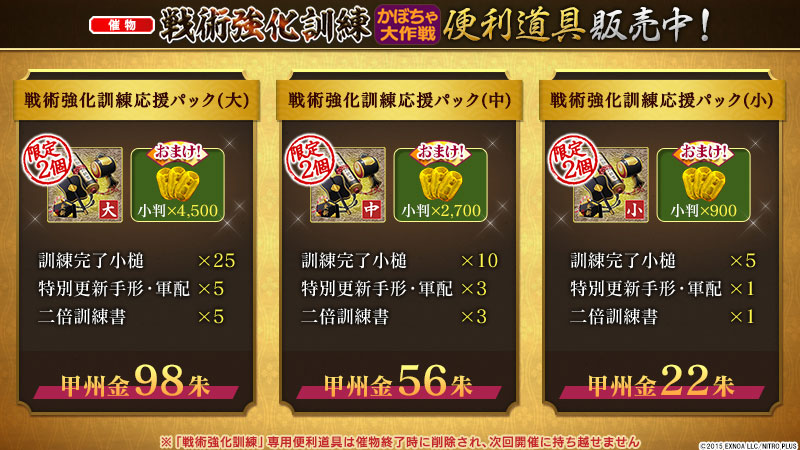 「戦術強化訓練 ~かぼちゃ大作戦~」の開催期間中、イベントを有利に進められる専用便利道具を期間限定で万屋で販売する。また、専用便利道具3種類のお得なパックも販売する。この機会にぜひ利用してほしい。
