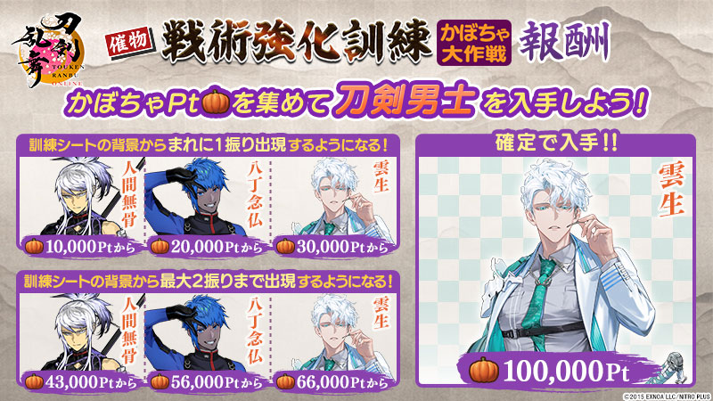 イベント「戦術強化訓練 ~かぼちゃ大作戦~」は、訓練パネルのさまざまな条件に合わせて部隊を編成し、条件を達成することで挑戦した訓練パネルを解放していくイベント。訓練パネルを解放すると「かぼちゃPt(かぼちゃポイント)」を入手でき、集めることで新刀剣男士「雲生(うんしょう)(cv.笠間淳)」のほか刀装や便利道具など、さまざまな報酬を獲得できる。