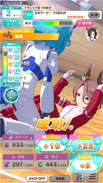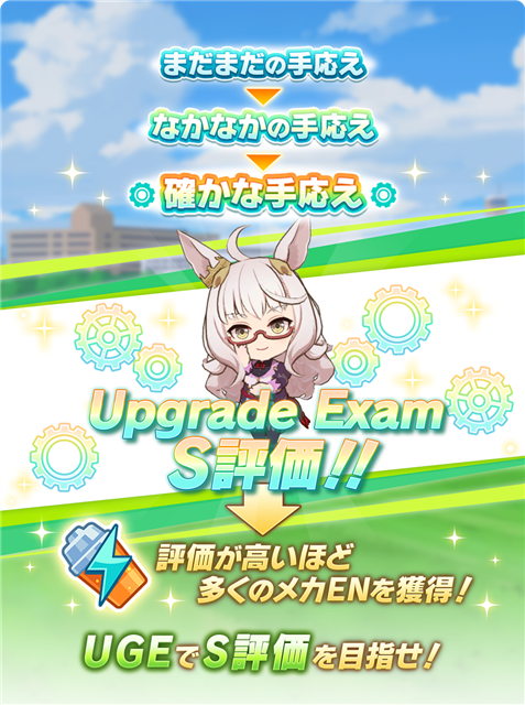 そしてジュニア12月、クラシック6月・12月、シニア6月・12月といういつものタイミングで「UGE(Upgrade Exam)」が開催され、研究Lvを十分に上げておくと良い評価を得られる。最高評価はSとなっており、良い評価であるほど獲得できるパラメータやスキルPtが上昇するというスタイルとなっている。