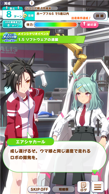 続いては育成について。本シナリオではメカウマ娘のサティと共にトレーニングを行うスタイル。普段通りにトレーニングを行うことで、メカウマ娘の研究Lvが上がっていく。メカギアのマークが付いているトレーニングを行うと、よりパラメータと獲得研究Lvの量がアップするなど、これまでのシナリオをプレイされたことがある方なら、すんなり理解できるシステムとなっている。