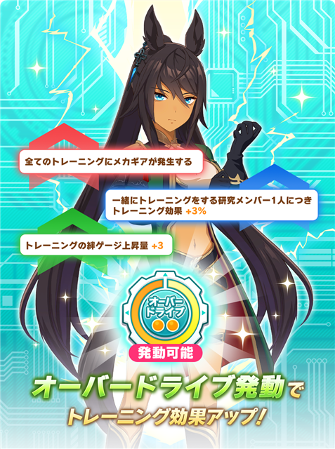 特徴的なのがオーバードライブだ。メカギア付きのトレーニングを行うとオーバードライブゲージが貯まり、3段階目に達するとオーバードライブを次のトレーニング以降、任意のタイミングで発動できる。どんな効果を発揮するのかというと……なんとメカウマ娘のチューニング次第で変化するのだ。
