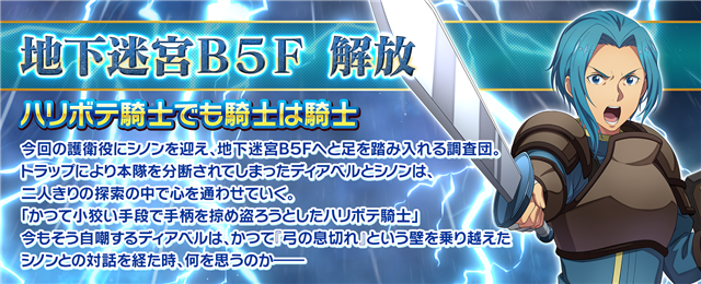 バンダイナムコエンターテインメントは、App Store/Google Play/Steamで配信中のMMORPG『ソードアート・オンライン インテグラル・ファクター(SAOIF)』において、シナリオ付き「地下迷宮B5F」クエストを解放した。地下迷宮B5Fではディアベル率いる調査団の護衛役にシノンを迎える。トラップにより本隊を分断されてしまったディアベルとシノンが、2人きりの探索の中で心を通わせていくストーリー。今回の解放と共にノクスインテグラルシリーズに新盾が追加される。