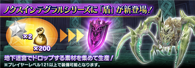 今回の解放と共にノクスインテグラルシリーズに盾が追加されます。地下迷宮でドロップする素材を集めて、新盾「ノクスフェルマー」を生産することができる。